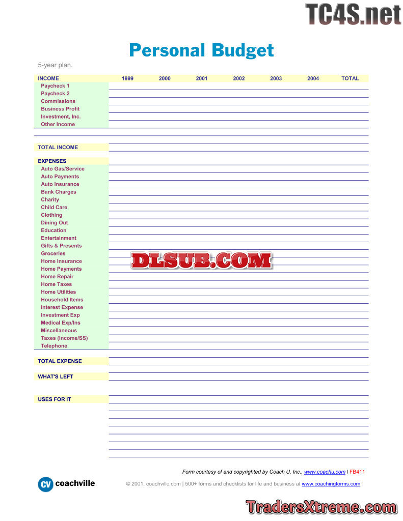 Personal Budget 5 Year Income Expense Projections - JPG Image File