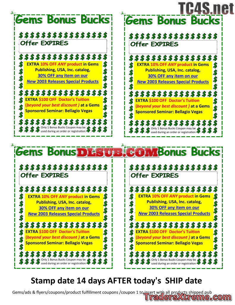 Coupon 1 To Insert With All Products Shipped Gems Bonus Bucks - JPG Image File